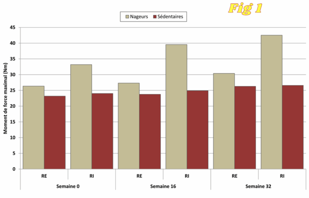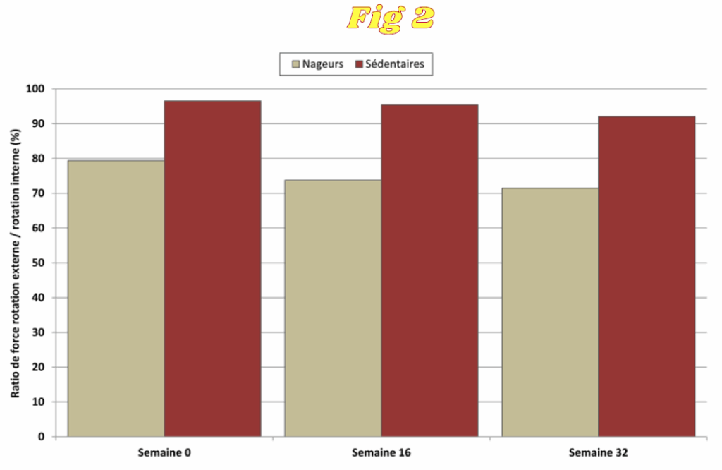 Les principaux résultats de cette étude ont montré que les semaines d’entraînement, les forces de rotation externe et interne des jeunes nageurs ont augmenté significativement (Fig. 1) et que le ratio rotation externe / rotation interne a diminué significativement (Fig. 2).