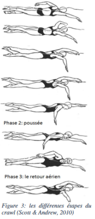 Le mouvement du crawl peut être analysé en 3 phases ; les deux premières sont aquatiques et la troisième est aérienne (Fernandez et al., 2012)